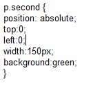 Si nous positionnons le second paragraphe en top : 0 et left: 0, voici ce que nous obtenons : le second paragraphe prend alors place en haut à gauche du document, sortant meme de la boîte de son parent le bloc div.